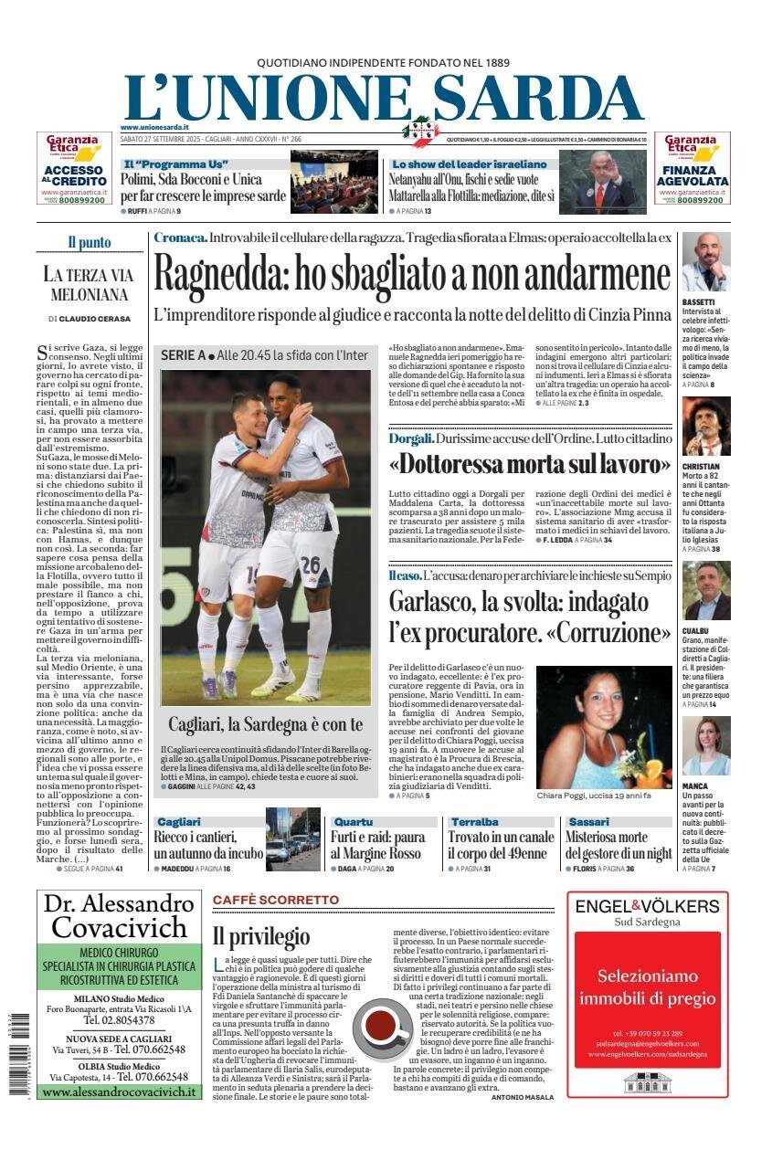 "Cagliari, la Sardegna è con te", titola in prima pagina L'Unione Sarda. Alle 20:45 la sfida con l'Inter. Nella prima sportiva: "E' il Cagliari giusto nel posto giusto al momento giusto". Dopo due vittorie, voglia d'impresa stasera alla Domus contro l'Inter.