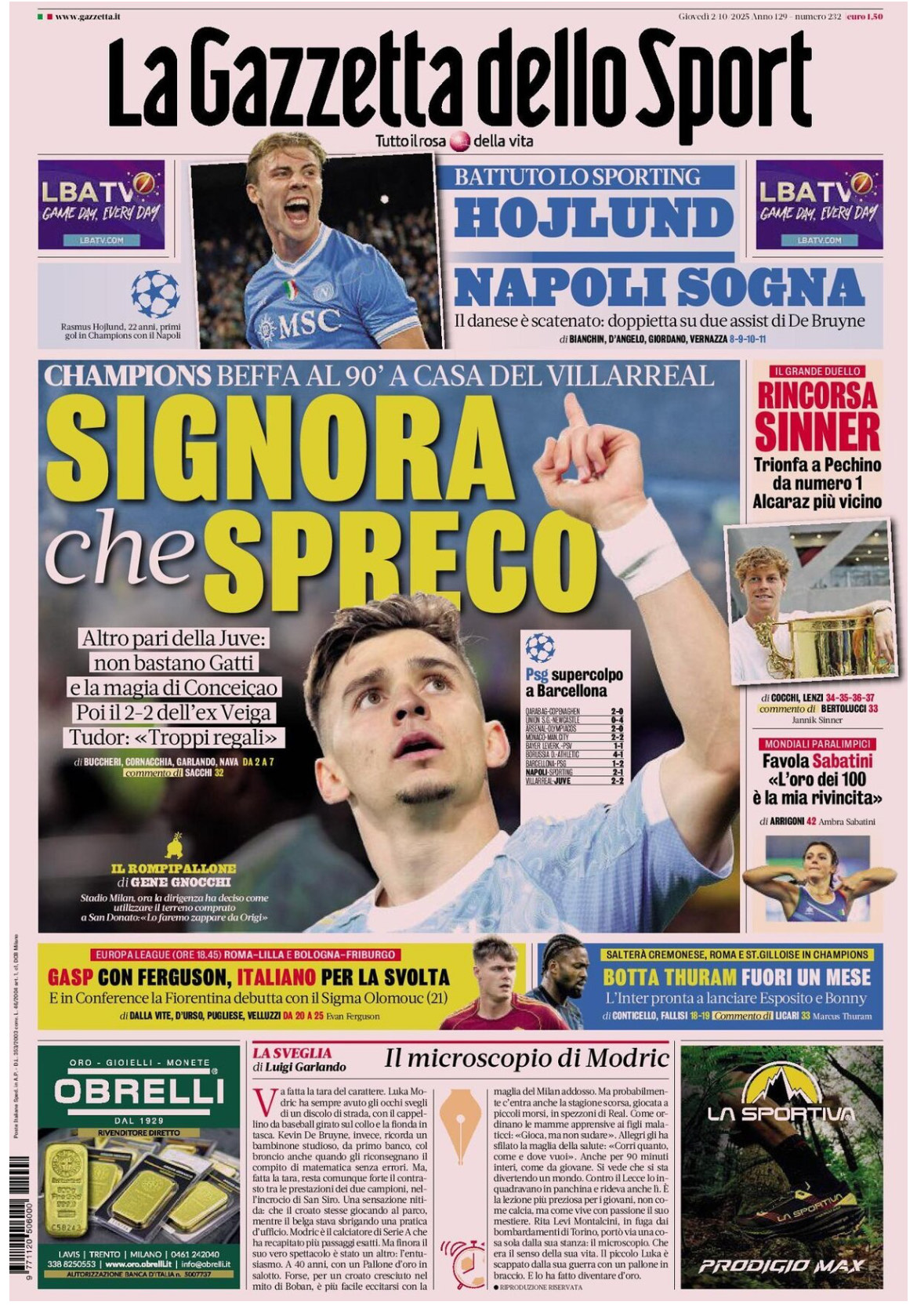 "Signora che spreco". Così apre La Gazzetta dello Sport. Champions, beffa al 90' a casa del Villarreal. Altro pari della Juve: non bastano Gatti e la magia di Conceiçao- Poi il 2-2 dell’ex Veiga. Tudor: «Troppi regali».