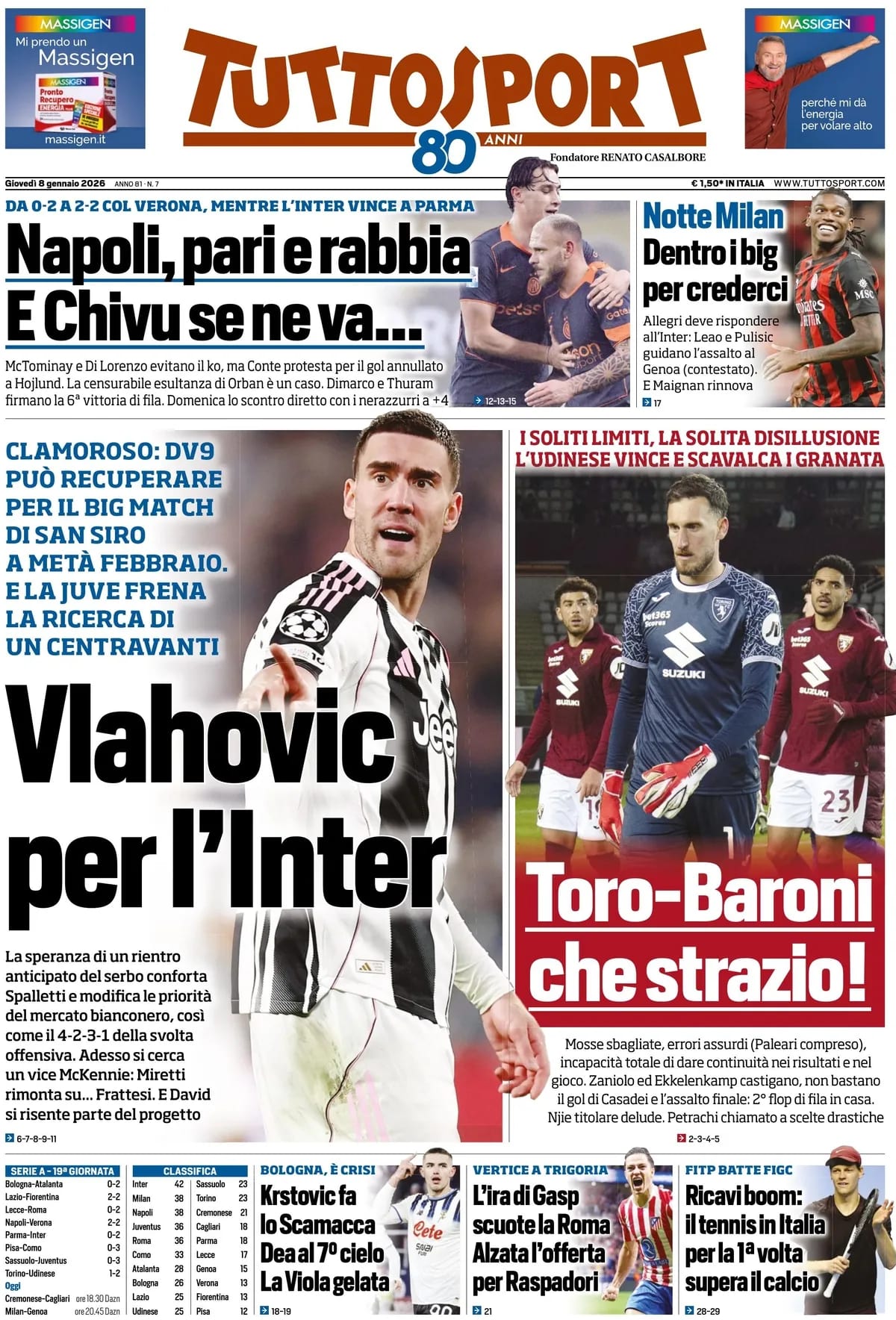 Taglio alto: "Napoli, pari e rabbia. E Chivu se ne va...". Da 0-2 a 2-2 col Verona, mentre l'Inter vince a Parma. McTominay e Di Lorenzo evitano il ko, ma Conte protesta per il gol annullato a Hojlund. La censurabile esultanza di Orban è un caso. Dimarco e Thuram firmano la 6ª vittoria di fila. Domenica lo scontro diretto con i nerazzurri a +4.