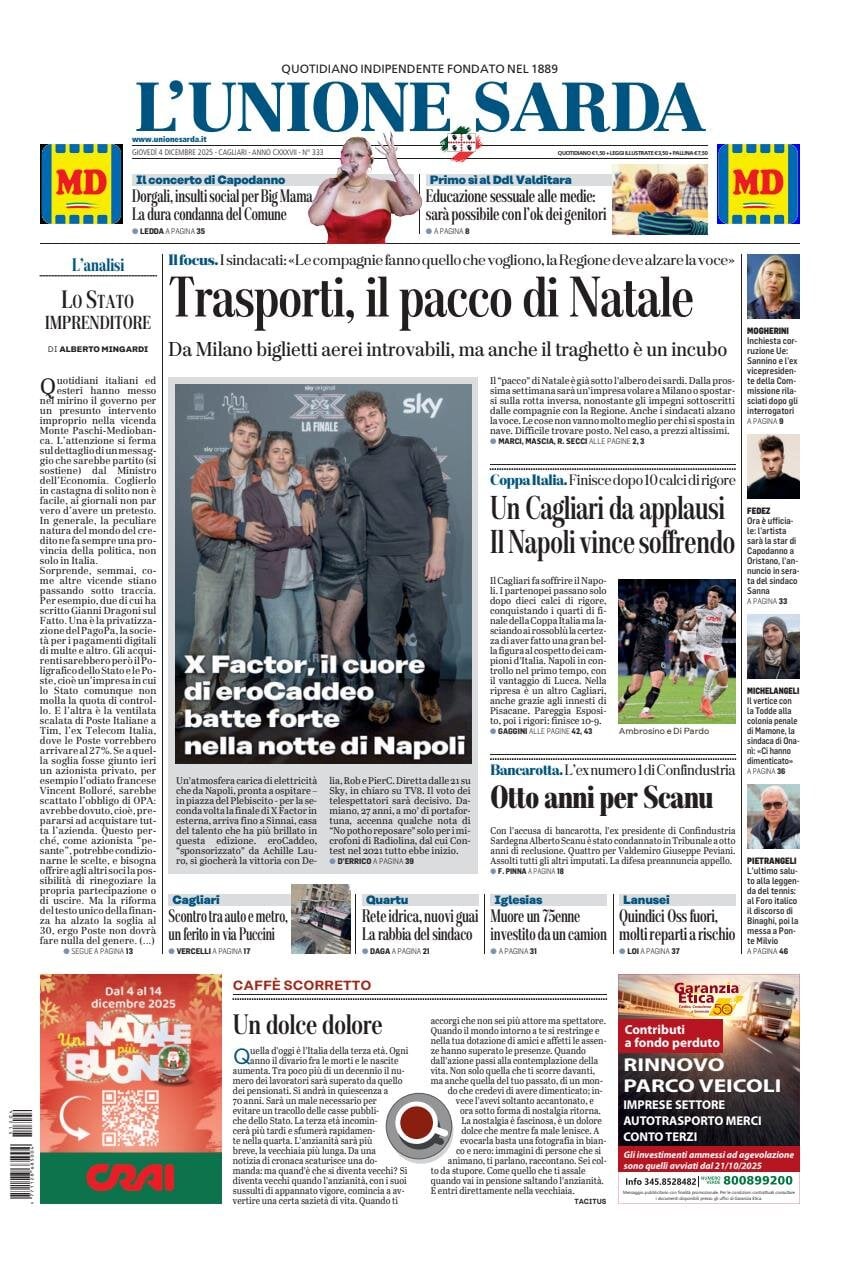 "Un Cagliari da applausi. Il Napoli vince soffrendo". Questo il titolo nella prima pagina de L'Unione Sarda. Coppa Italia. Finisce dopo 10 calci di rigore. Nella prima sportiva: "Cagliari, maledetti calci di rigore". Una grande prova a Napoli, ma cede dagli undici metri e saluta la Coppa Italia. Esposito replica a Lucca: finisce 1-1. Fatali poi dal dischetto gli errori di Felici e Luvumbo.