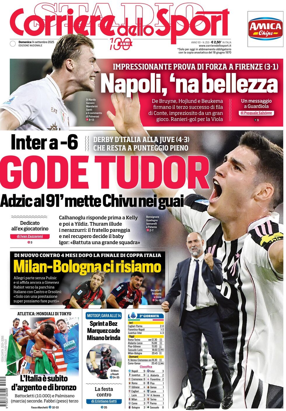 "Gode Tudor". Così apre l'edizione odierna del Corriere dello Sport. Adzic al 91’ mette Chivu nei guai. Inter a -6. Derby d'Italia alla Juve (4-3) che resta a punteggio pieno. Calhanoglu risponde prima a Kelly e poi a Yildiz. Thuram illude i nerazzurri: il fratello pareggia e nel recupero decide il baby Igor: «Battuta una grande squadra».