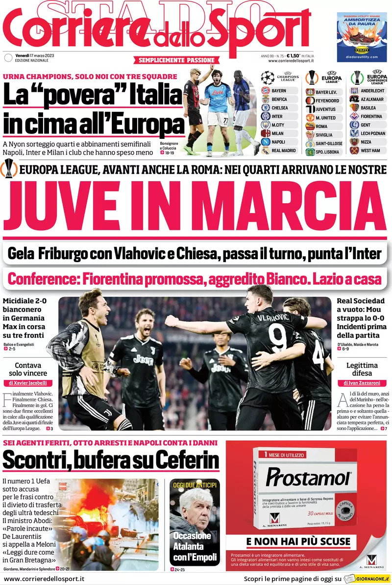 "Juve in marcia". Così apre stamani il Corriere dello Sport. Europa League, avanti anche la Roma: nei quarti arrivano le nostre. Gela Friburgo con Vlahovic e Chiesa, passa il turno, punta l’Inter. Conference: Fiorentina promossa, aggredito Bianco. Lazio a casa. Micidiale 2-0 bianconero in Germania. Max in corsa su tre fronti. Real Sociedad a vuoto: Mou strappa lo 0-0. Incidenti prima della partita.