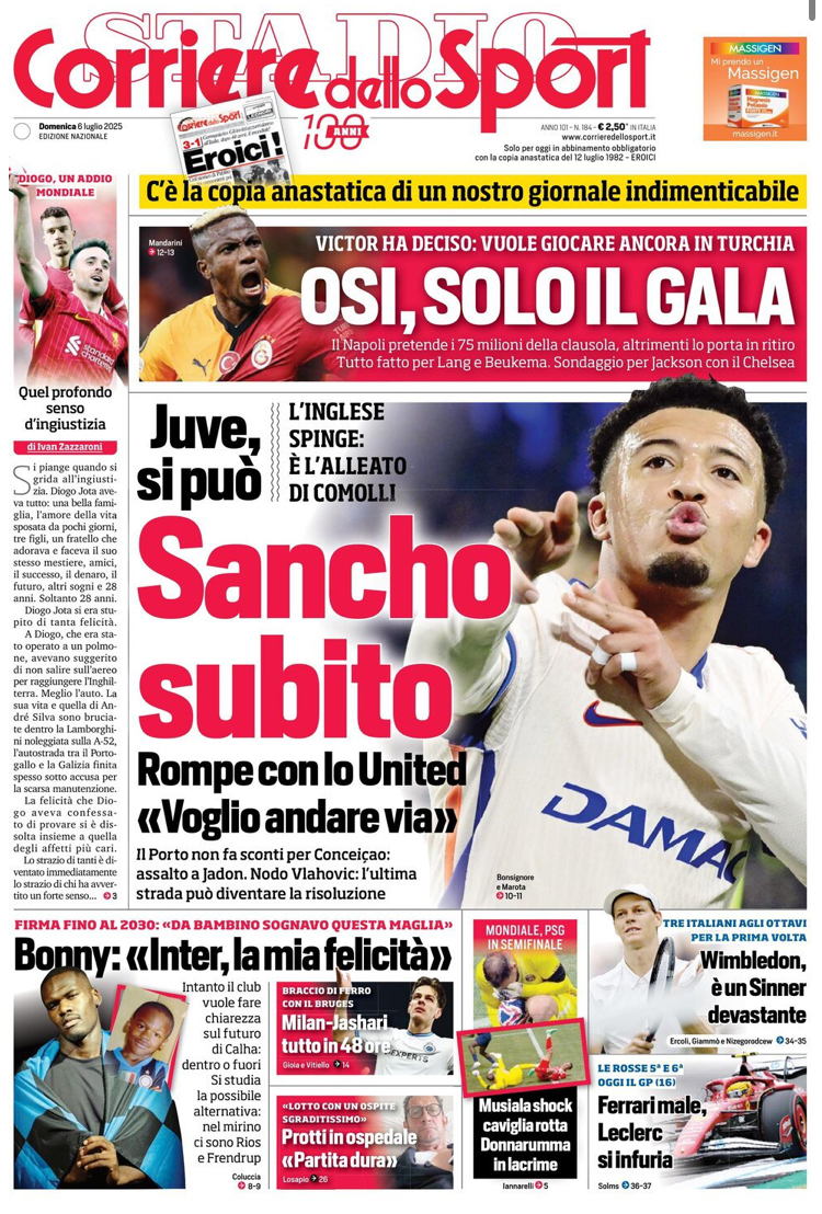 "Sancho subito", è l'apertura del Corriere dello Sport. Juve, si può. L'inglese spinge: è l'alleato di Comolli. Rompe con lo United: «Voglio andare via». Il Porto non fa sconti per Conceiçao: assalto a Jadon. Nodo Vlahovic: l’ultima strada può diventare la risoluzione.