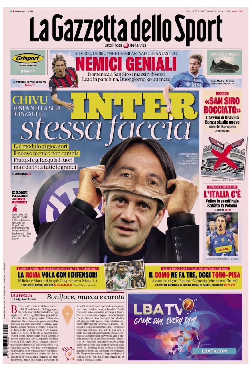 "Inter, stessa faccia". Così apre stamattina La Gazzetta dello Sport. Chivu resta nella scia di Inzaghi. Dal modulo ai giocatori il nuovo tecnico non cambia. Frattesi e gli acquisti fuori ma è dietro a tutte le grandi.
