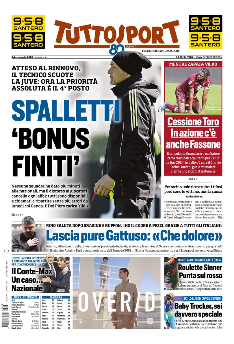 "Spalletti: 'Bonus finiti'". Questa l'apertura di Tuttosport. Atteso al rinnovo, il tecnico scuote la Juve: ora la priorità assoluta è il 4° posto. Nessuna squadra ha dato più minuti alle nazionali, ma il discorso ai giocatori cancella ogni alibi: tutti sono disponibili e chiamati a ripartire senza più errori da lunedì col Genoa. E Del Piero carica Yildiz.