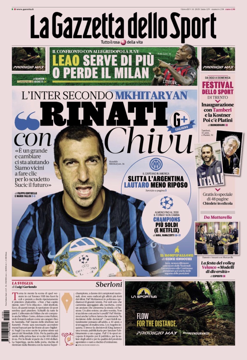 L'apertura della Gazzetta dello Sport: "'Rinati con Chivu'". L'Inter secondo Mkhitaryan. «È un grande e cambiare ci sta aiutando. Siamo vicini a fare clic per lo scudetto. Sucic il futuro».