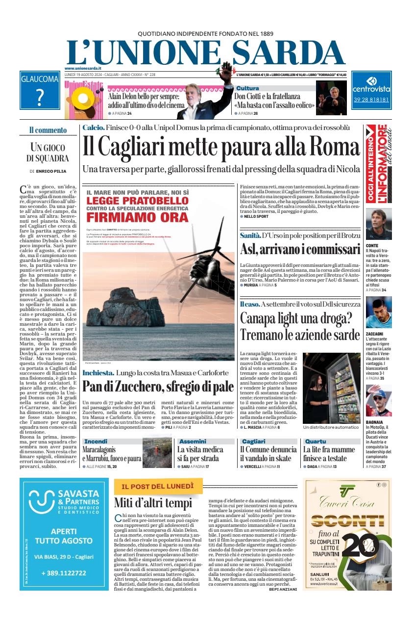 "Il Cagliari mette paura alla Roma", è l'apertura de L'Unione Sarda. Una traversaa per parte, giallorossi frenati dal pressing della squadra di Nicola. Finisce 0-0 alla Unipol Domus la prima di campionato,ottima prova dei rossoblù.