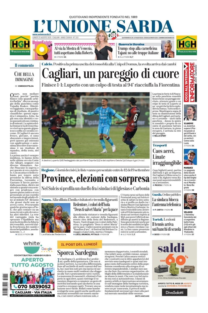 "Cagliari, un pareggio di cuore", è l'apertura de L'Unione Sarda. Finisce 1-1: Luperto con un colpo di testa al 94' riacciuffa la Fiorentina. Positiva la prima uscita dei rossoblù alla unipol Domus, la svolta arriva dai cambi.