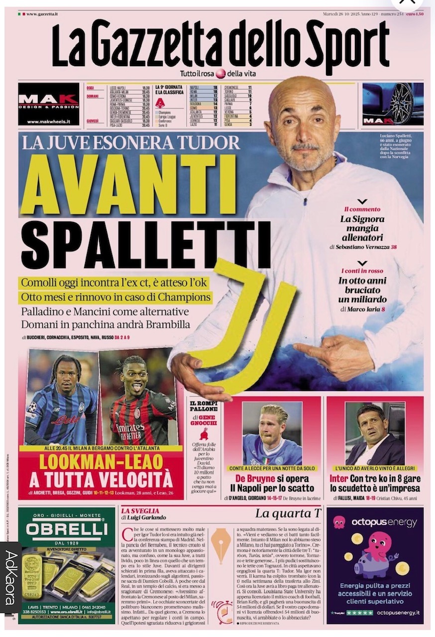 "Avanti Spalletti". Così apre l'edizione odierna de La Gazzetta dello Sport. La Juve esonera Tudor. Comolli oggi incontra l’ex ct, è atteso l’ok. Otto mesi e rinnovo in caso di Champions. Palladino e Mancini come alternative. Domani in panchina andrà Brambilla.
