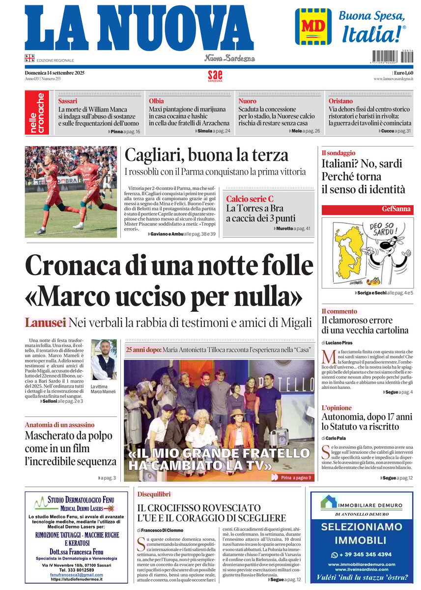 "Cagliari, buona la terza", titola in prima pagina La Nuova Sardegna. I rossoblù con il Parma conquistano la prima vittoria. Nella prima sportiva: "Mina e Felici lanciano il Cagliari". La prima vittoria sofferta arriva contro il parma, Caprile fa due miracoli in porta. Esordio brillante di Belotti entrato nell'azione del gol che sblocca la partita. Il difensore colombiano ancora a segno dopo la rete firmata in nazionale. Seba Esposito sempre nel vivo del gioco.