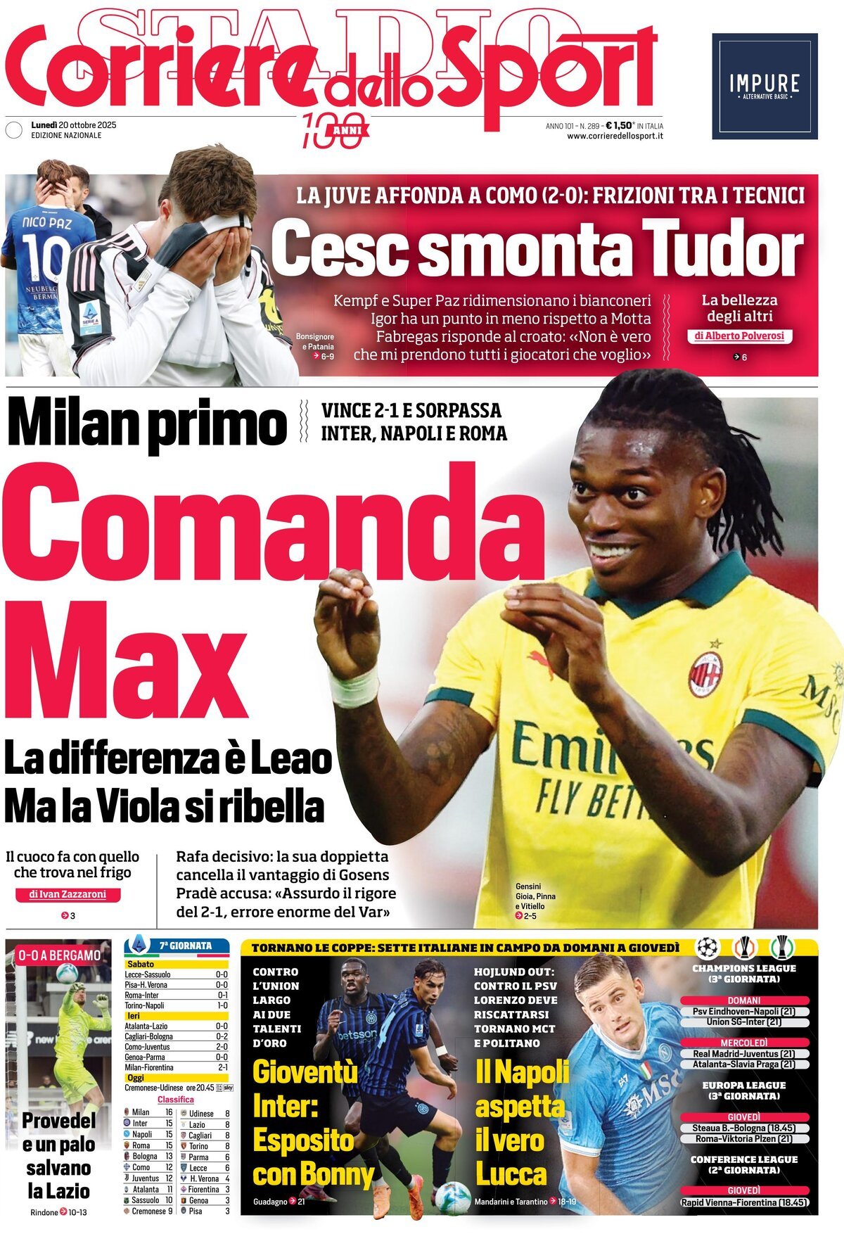 "Comanda Max", è l'apertura del Corriere dello Sport. Milan primo. Vince 2-1 e sorpassa Inter, Napoli e Roma. La differenza è Leao. Ma la Viola si ribella. Rafa decisivo: la sua doppietta cancella il vantaggio di Gosens. Pradè accusa: «Assurdo il rigore del 2-1, errore enorme del Var».