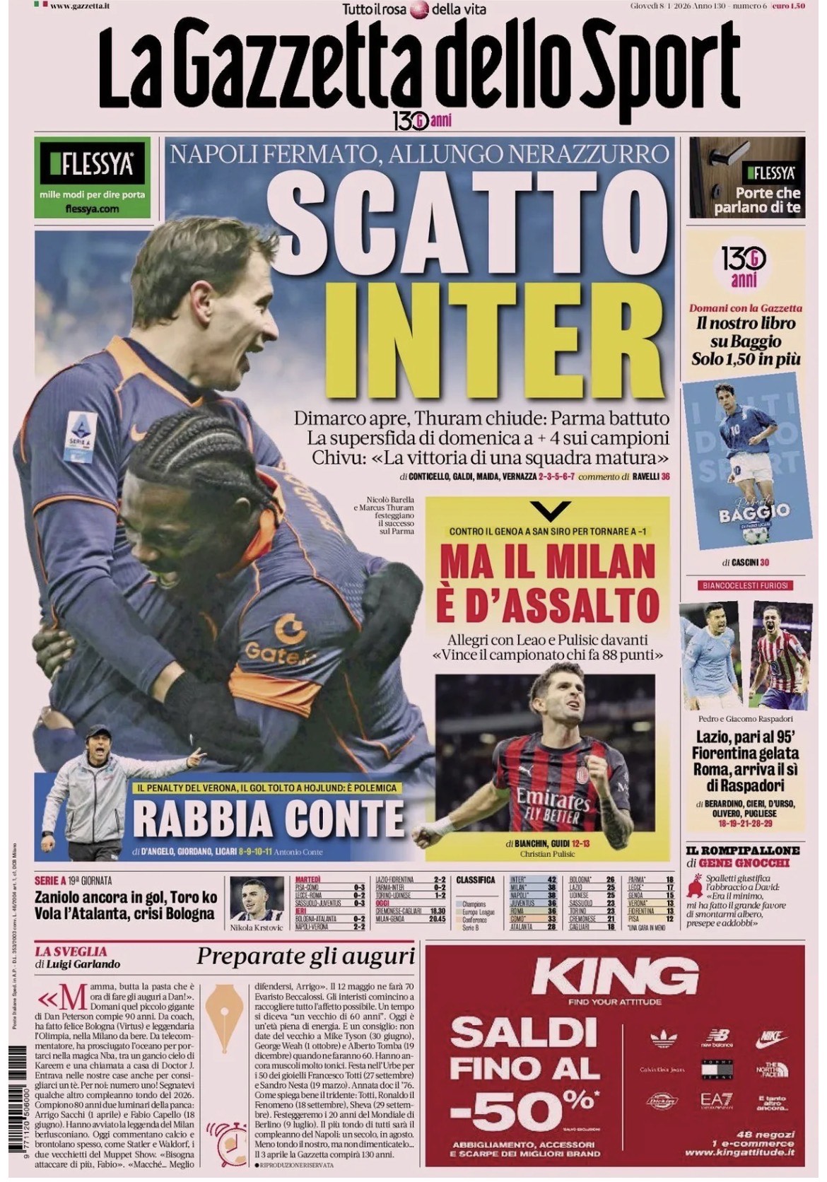 "Scatto Inter", è l'apertura della Gazzetta dello Sport. Napoli fermato, allungo nerazzurro. Dimarco apre, Thuram. chiude: Parma battuto. La supersfida di domenica a + 4 sui campioni. Chivu: «La vittoria di una squadra matura».