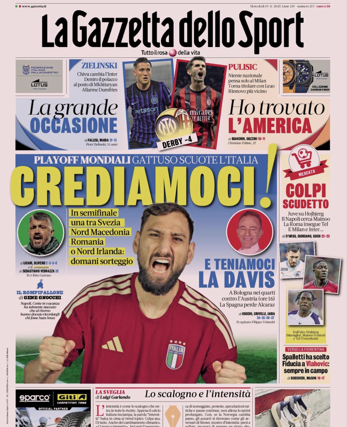 "Crediamoci!", è l'apertura della Gazzetta dello Sport. Playoff mondiali, Gattuso scuote l'Italia. In semifinale una tra Svezia, Nord Macedonia, Romania o Nord Irlanda: domani sorteggio.