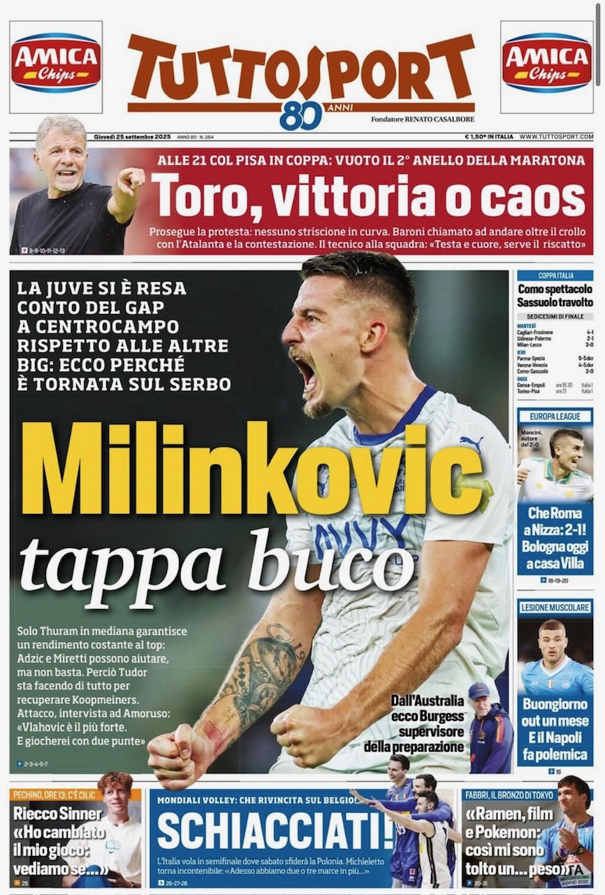 "Milinkovic tappa buco", è l'apertura di Tuttosport. La Juve si è resa conto del gap a centrocampo rispetto alle altre big: ecco perchè è tornata sul serbo. Solo Thuram in mediana garantisce un rendimento costante al top: Adzic e Miretti possono aiutare, ma non basta. Perciò Tudor sta facendo di tutto per recuperare Koopmeiners. Attacco, intervista ad Amoruso: «Vlahovic è il più forte. E giocherei con due punte».