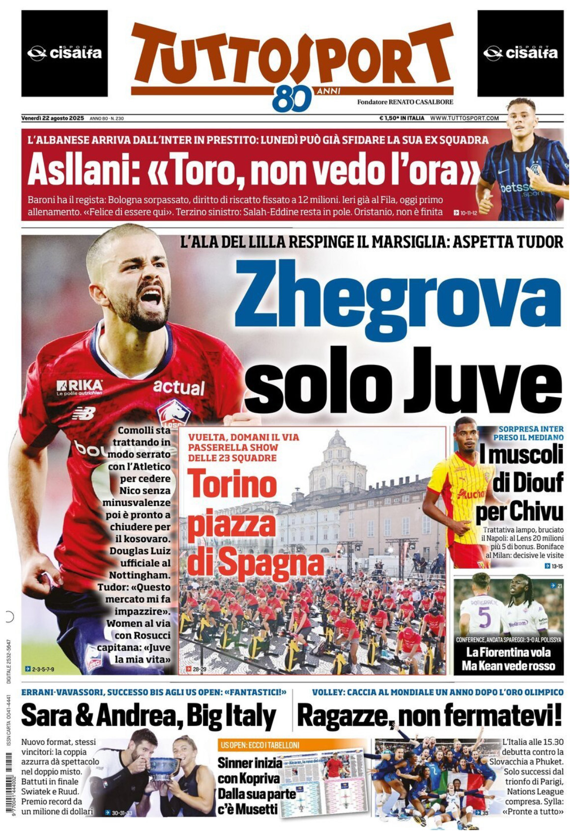 "Zhegrova solo Juve". Così apre Tuttosport. L'ala del Lilla respinge il Marsiglia: aspetta Tudor. Comolli sta trattando in modo serrato con l’Atletico per cedere Nico senza minusvalenze poi è pronto a chiudere per il kosovaro. Douglas Luiz ufficiale al Nottingham. Tudor: «Questo mercato mi fa impazzire». Women al via con Rosucci capitana: «Juve la mia vita».